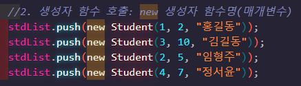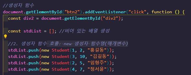 - 2. 생성자 + new 생성자()를 이용한 생성 방법 : const stdList = []; //비어 있는 배열 생성