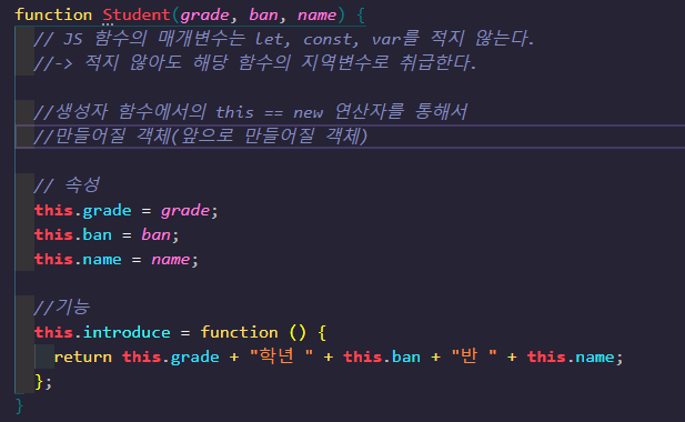 - 생성자 함수에서 this == new 연산자를 통해 앞으로 만들어질 객체 속성을 정의한다.