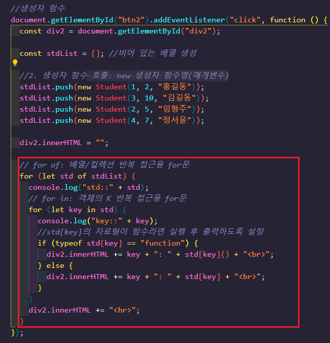 2. 생성자 함수를 통한 객체 생성: for of(let 객체명 of 객체배열) -> 배열/컬렉션 반복 접근용 for문