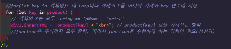 - 매 loop마다 객체의 key를 하나씩 가져와 key 변수에 저장한다
