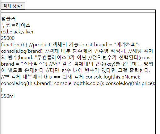 - 앞 선 btn1에서는 객채 내용을 출력할 때 function을 실행하지 않고 그 내용을 문자열형태로 그대로 출력했다.