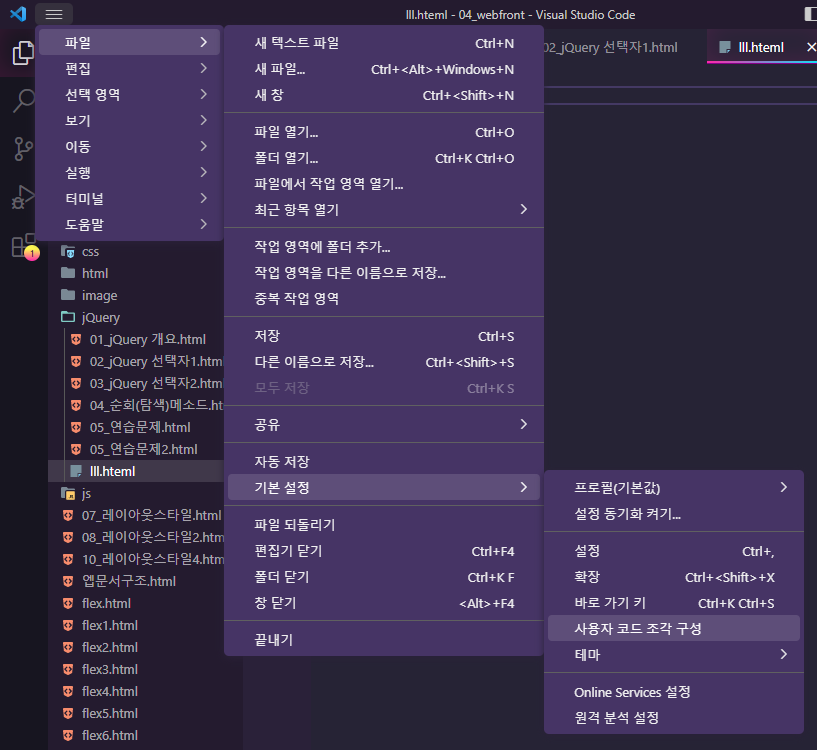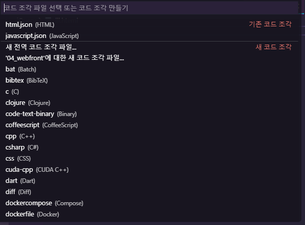 1. 파일 -> 기본 설정 -> 사용 코드 조각 구성 선택