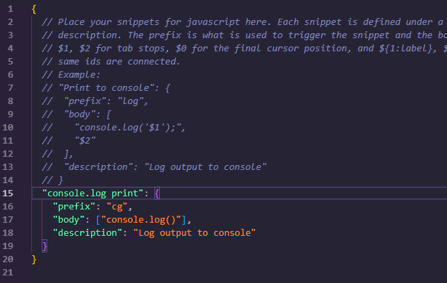 ** 단축키를 직관적으로 cl로 설정하려고 했지만 class를 워낙 자주 쓰기 때문에 사용의 편리성을 위해 "prefix":"cg"로 설정했다. 사용자가 편한 단축키로 설정하면 된다~~~