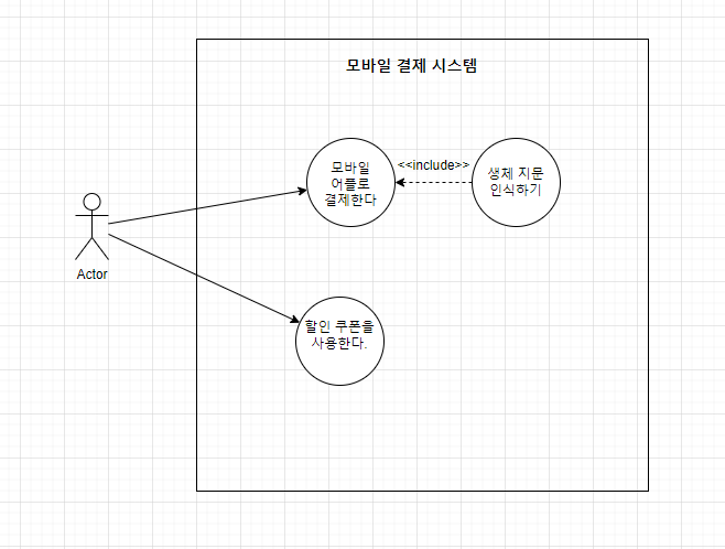 - 시스템(System): 만들고자 하는 프로그램을 의미한다. 유스케이스들을 둘러산 사각형의 틀로 표현하며 시스템 명칭을 안쪽 상단에 작성한다.