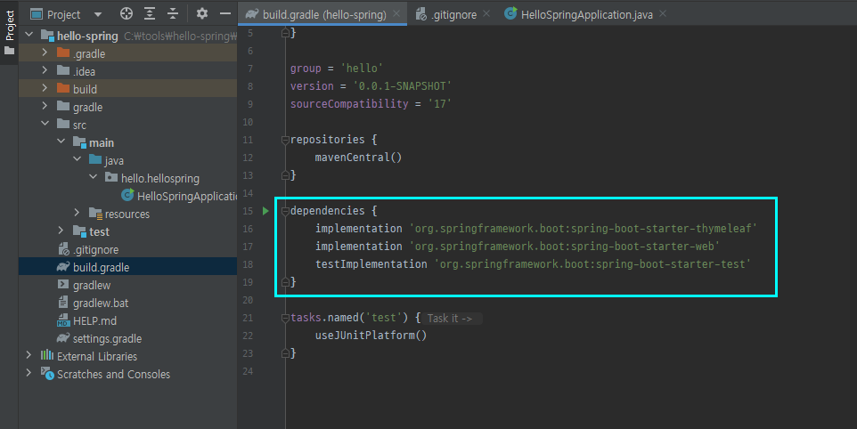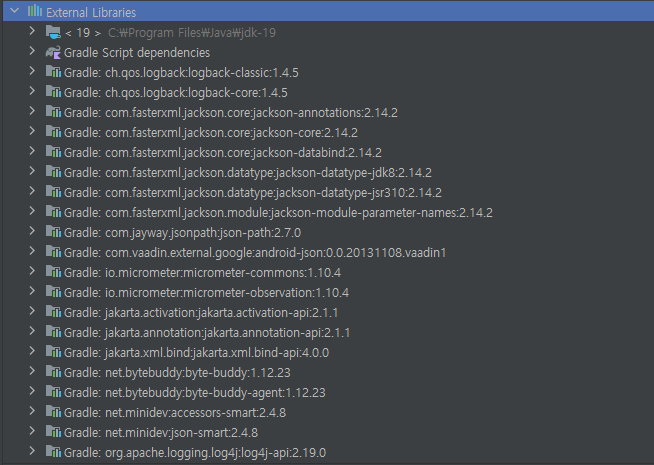 - build.gradle에서 확인할 수 있는 라이브러리는 SPRING 설치 당시 추가했던 의존관계밖에 없다.