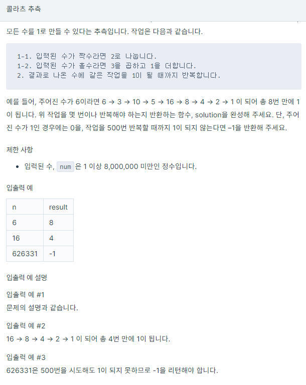 - ์ ํ ์ฌํญ์ ์ ๋ณด๋ฉด num์ ๋ฒ์๊ฐ 8,000,000์ธ๋ฐ ์ง์์ ๊ฒฝ์ฐ ๋๋๊ธฐ 2๋ฅผ ํ๋ฏ๋ก ์ซ์๋ ์ค์ด๋ค์ง๋ง ํ์์ ๊ฒฝ์ฐ *3+1์ ์ํํ๊ธฐ ๋๋ฌธ์ int๊ฐ ๋ฐ์ดํฐ ๋ฒ์๋ฅผ ๋์ด์๋ ๊ฒฝ์ฐ๊ฐ ์๊ธด๋ค.