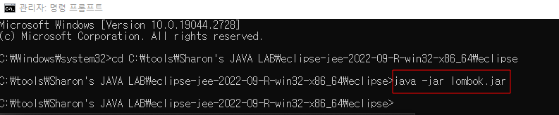 2. 관리자 권한으로 cmd를 실행하고 이클립스가 설치된 경로로 cmd 경로를 바꿔 준 뒤 java -jar lombok.jar를 입력한다