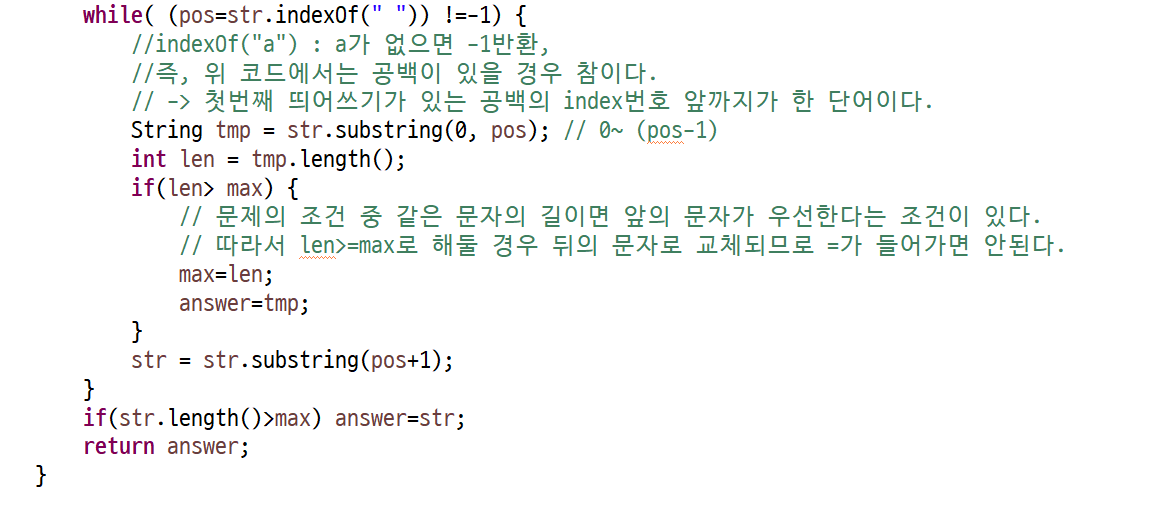 - 단! (pos=str.indexOf(" ")) !=-1 조건에 의해 마지막 단어는 뒤에 공백이 없으므로 단어 길이에 상관 없이 false가 되어 while문이 종료된다.