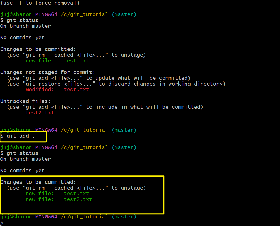** 현재 Working Directory에 있는 모든 변경사항을 다 올릴 때는 git add . 을 사용한다 (. 은 all을 의미한다)
