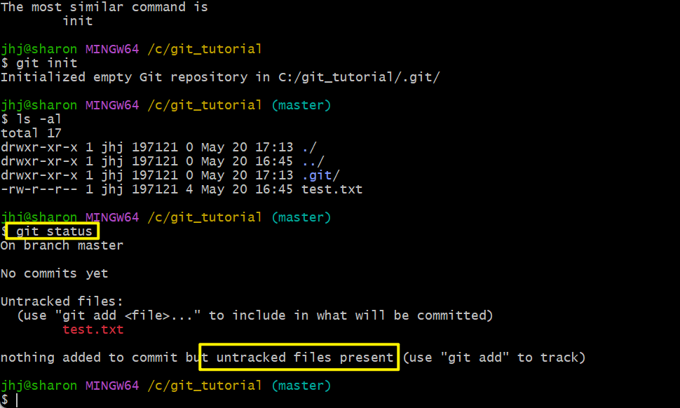 - untracked files : 변경사항이 있지만 아직까지 버전관리(add or commit)가 안된 새로 생긴 파일