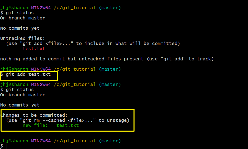 - git add 후 status 통해 상태를 보면 현재 commit되지 않은 파일이 있다고 알려준다. 형상관리(add)가 이루어진 상태이므로 untracked는 더 이상 나타나지 않는다.