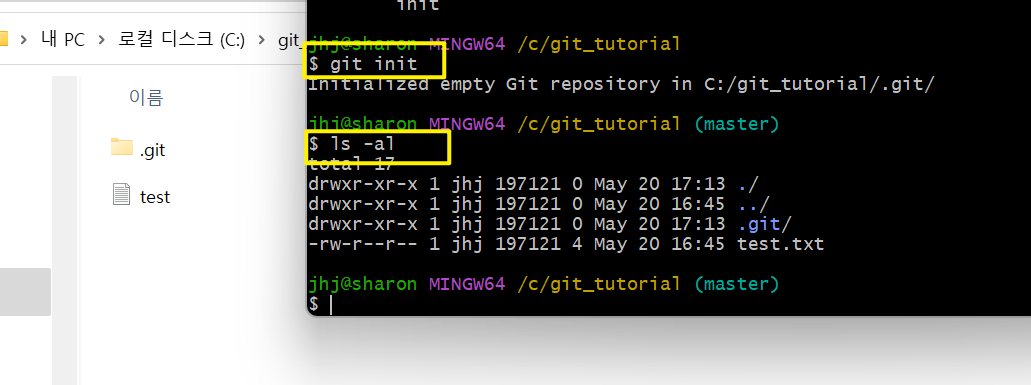 - $ ls -al : 숨긴파일일 경우 .git 폴더가 안보이는데 이 때 숨긴 파일까지 모두 보여주는 명령어