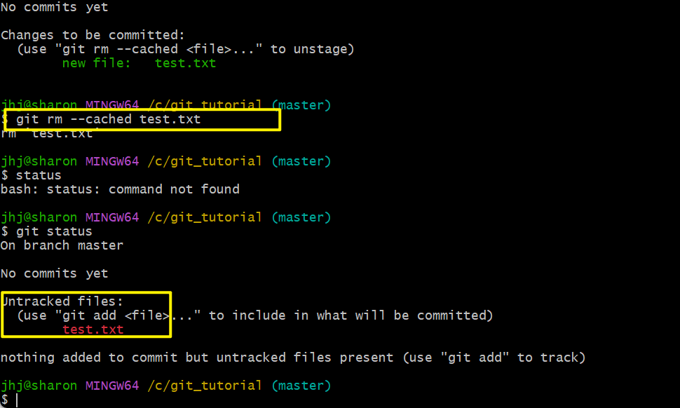 - 터미널 창에서 보여지듯 스테이지에 올라온 파일을 다시 스테이지에서 내릴 수 있다 : git rm --catched <file>