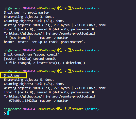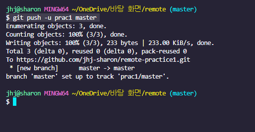 - $ git push -u prac1 master : prac1이라는 별명을 가진 원격저장소에 로컬저장소의 master를 push해라.
