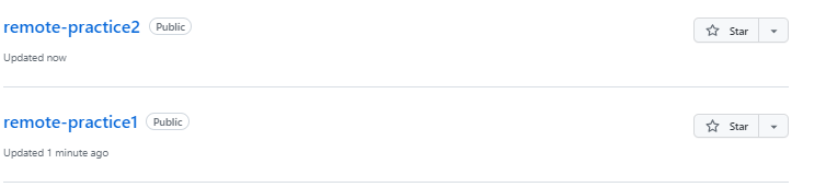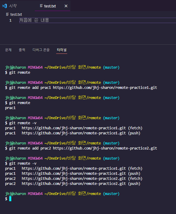 - 로컬 저장소 remote2와 원격저장소 remote-practice2를 origin이라는 이름으로 연결한다.