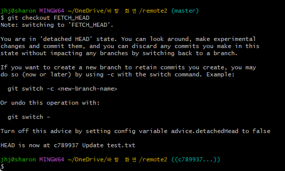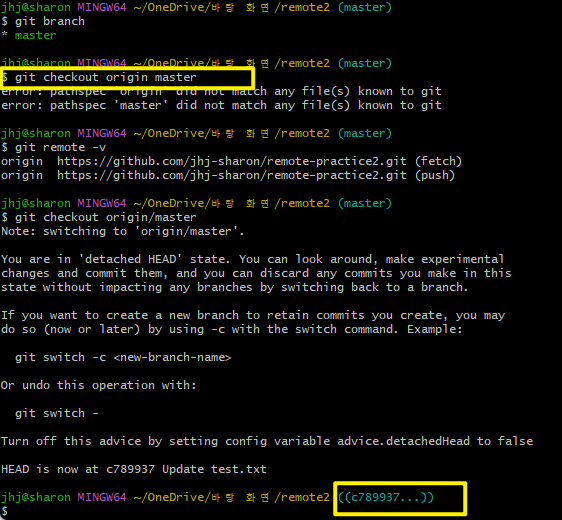 - $ git checkout origin/master : origin의 master로 이동하는 명령어인데, c789937..로 이동한 것을 볼 수 있다