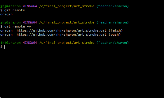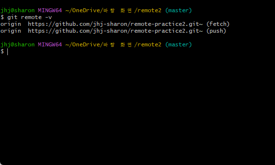 - $ git remote -v : 현재 연결된 원격저장소 별명과 url함께 보기