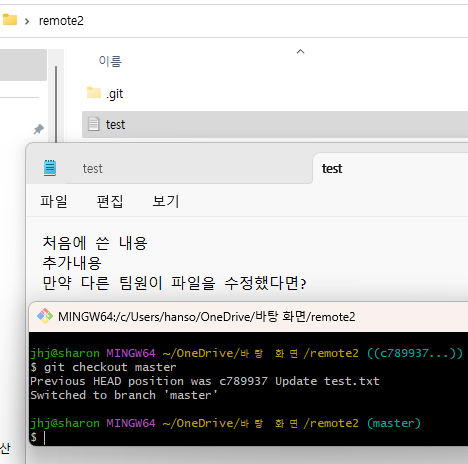 - $ git checkout master로 다시 돌아오면 해당 변경 사항은 다시 없어진다.