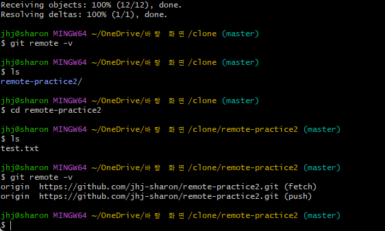 - 로컬에 clone이라는 새 폴더 만들어줬다.