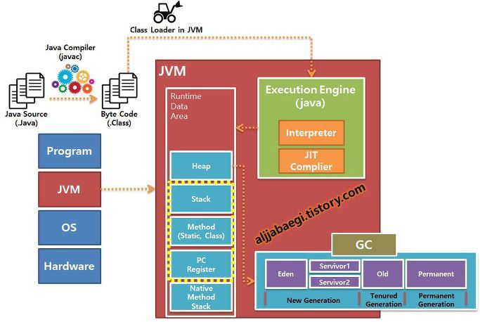 - 인터프리터 : 바이트 코드 명령어를 하나씩 읽어서 해석하고 실행한다. 하나하나의 실행은 빠르나, 전체적인 실행 속도 가 느리다는 단점이 있다.