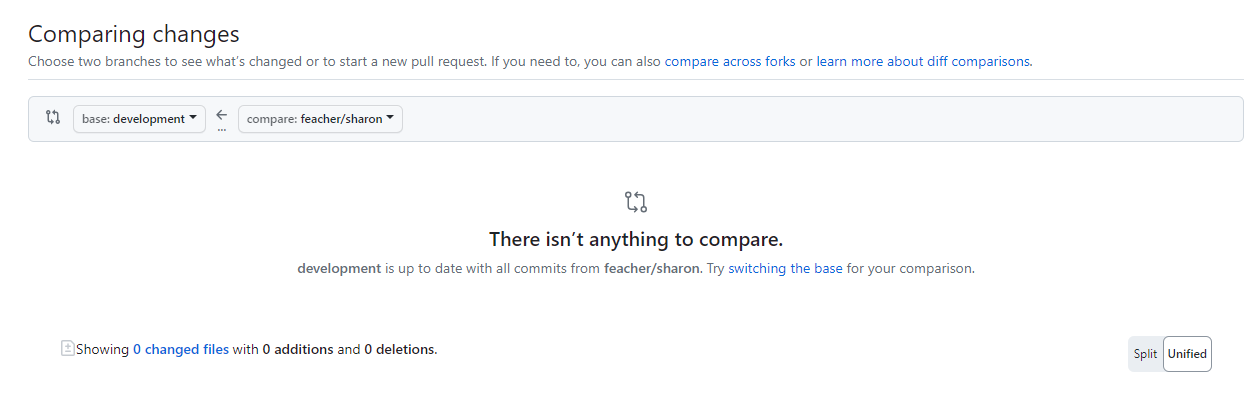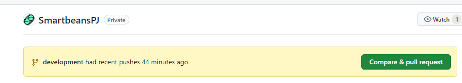- github 메인페이지에서 main과 development 혹은 development와 feacher의 버전이 상이할 경우 Compare & pull request 버튼이 생성된다.