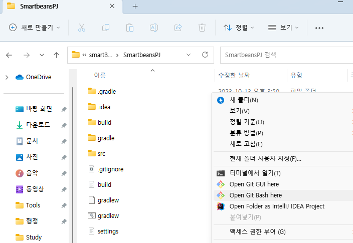 - 현재 폴더 안에서 오른쪽 클릭을 통해 git bash를 실행한다. git bash가 안보일 경우 더 많은 옵션 보기 확인.