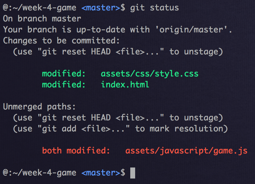 ** 현재 내 로컬 레파지토리의 변경 내용이 어느단계까지 반영되었나를 확인하기 위해서는 'git status'명령어를 사용한다. 변경되었지만 add가 되지 않은 파일명은 붉은색으로 표시되고 add 후 commit이 가능한 파일은 초록색으로 표시된다.