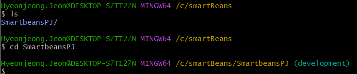 - 이 때 clone을 해온 repository 내부로 이동해야한다. ls(목록출력 명령어)를 써서 가져온 폴더를 확인하고 cd 명령어를 통해 해당 폴더의 bash로 이동한다.