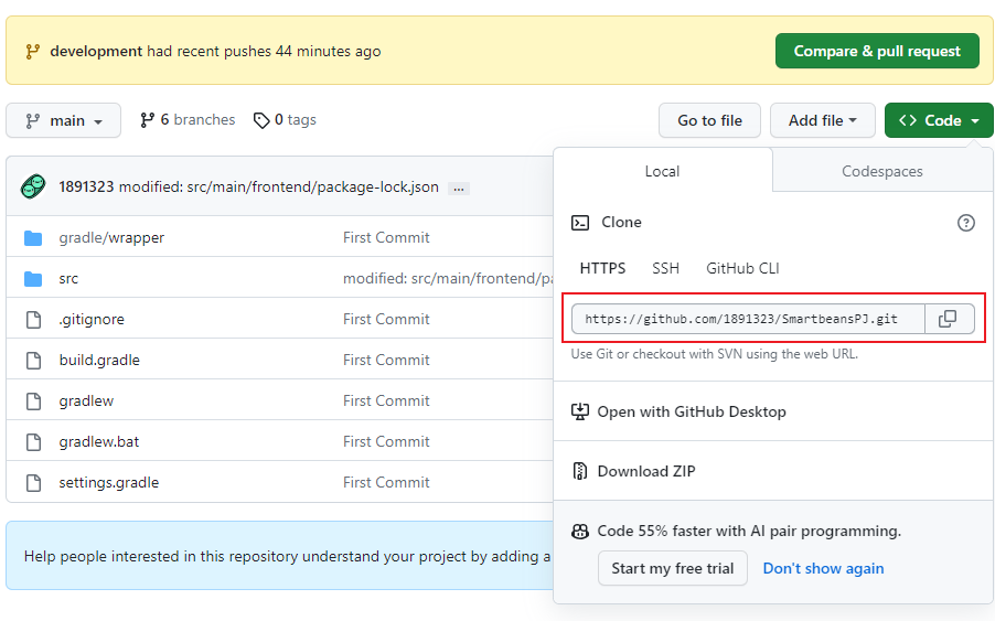 - github 메인페이지에서 main과 development 혹은 development와 feacher의 버전이 상이할 경우 Compare & pull request 버튼이 생성된다.