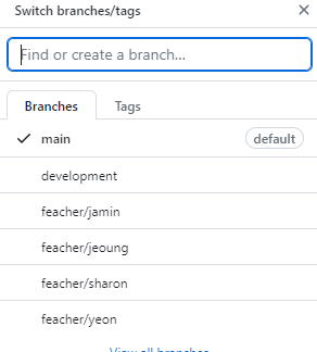 - 원격 저장소에서 가져온 development를 이용해 각자의 브랜치를 만든다. 이 때 반드시 development로 이동되어 있는 상태여야 한다.