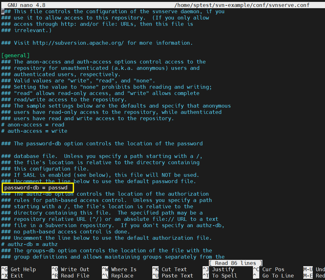 - nano /home/sptest/svn-example/conf/svnserve.conf