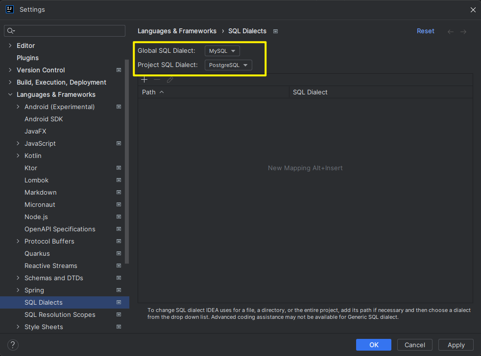 - 오른쪽 패널에서 프로젝트 또는 특정 디렉토리에 대한 SQL Dialect를 PostgreSQL로 설정
