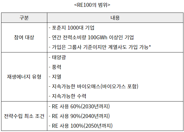 RE100은 “Renewable Energy 100%”의 약어로, 규모가 큰 기업들을 중심으로 생산 등 비즈니스 활동에서 소비하는 에너지 중 전력에 대해 100%를 재생에너지로 충당하도록 요구하기 위해 결성된 국제 캠페인이다. 다국적 비영리단체인 기후그룹(The Climate Group)과 탄소정보공개 프로젝트(Carbon Disclosure Project, CDP)가 연합해 2014년 뉴욕 기후주간(NYC Climate Week) 행사에서 출범했다.