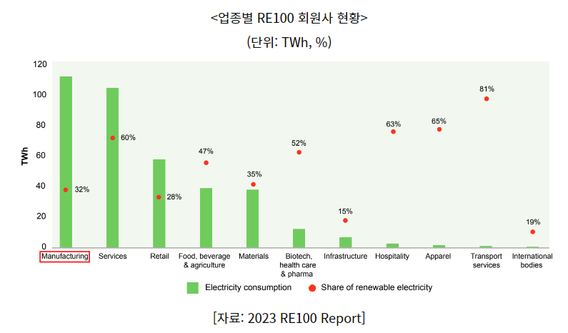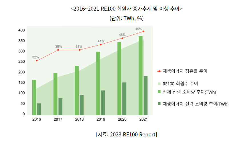 RE100 연간 보고서에서는 점차 많은 회원사가 전사적인 차원에서 소비전력을 재생 에너지로 대체할 뿐만 아니라 공급망에도 재생에너지원 전력을 사용하도록 요구하고 있다는 점을 언급하고 있다. 이는 RE100 전환은 선택이 아닌 필수 사항이 되고 있다는 것을 의미한다.