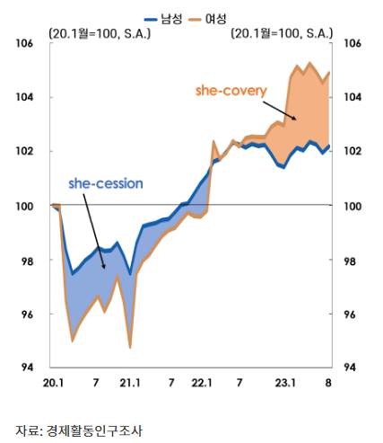 - she-covery : 팬데믹 침체이후 노동시장이 회복하는 과정에서 여성 중심으로 고용이 증가하는 현상
