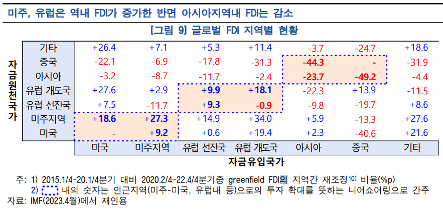미·중 갈등 등으로 인해 기업들의 해외투자에 있어 경제적 요인 외에 지정학적 요인이 함께 고려되면서 각국의 FDI 흐름에서 지역적 분절화가 나타나고 있다. 지역별 FDI 유출입 흐름을 2020년 기준으로 비교해보면 프렌드쇼어링(friend-shoring, 우방국 중심의 투자), 니어쇼어링(near-shoring, 인근지역으로의 투자 확대)이 함께 진행되고 있다.