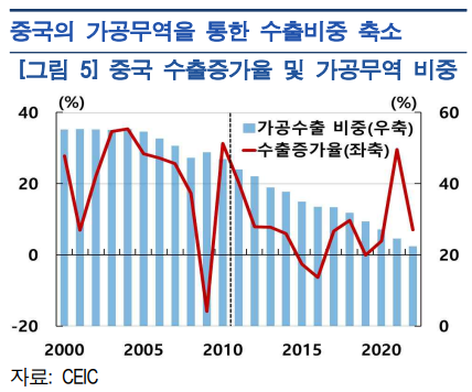 2008년 글로벌 금융위기에 따른 경기침체에 대응하여 중국정부가 내수활성화정책을 시행한 가운데 중국의 인건비가 2010년대 들어 베트남, 인도네시아 등 여타 신흥국 대비 빠르게 상승하였다. 이에 따라 글로벌 분업구조에서 우위를 차지했던 저비용 생산구조가 점차 약화되었고, 중국의 자체 기술경쟁력도 높아지면서 임가공 위주의 생산거점 역할이 축소되었다.
