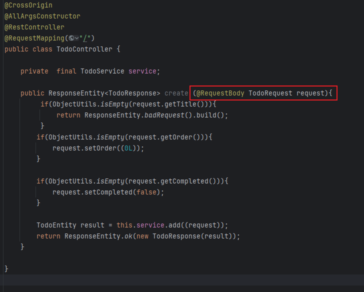 ์๋ ์์์์ ๋ณผ ์ ์๋ ๊ฒ์ฒ๋ผ HTTP ์์ฒญ์ ๋ณธ๋ฌธ(json or xml ํํ)์ด TodoRequest ๊ฐ์ฒด์ ์๋์ผ๋ก ๋งคํ๋๋ ๊ฒ์ด๋ค.