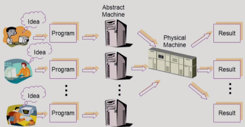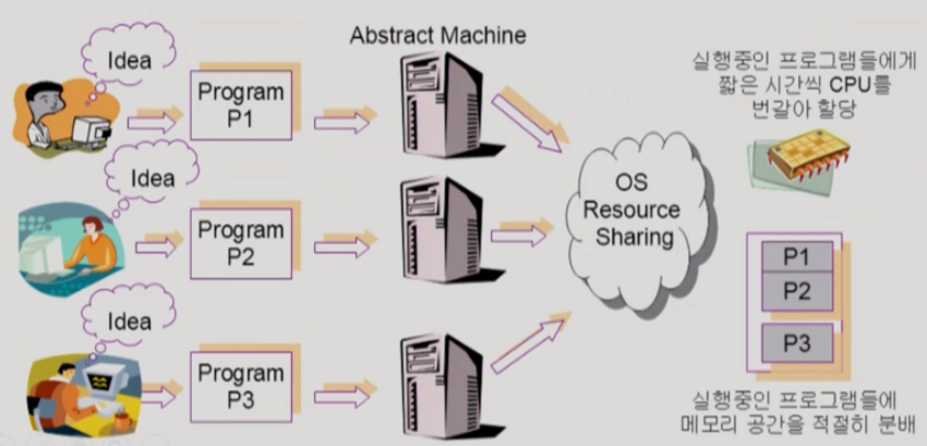 - 여러 프로그램들이 한 대의 컴퓨터를 운용하지만 추상적으로 단독으로 사용하는 것 같은 환상을 갖게한다.