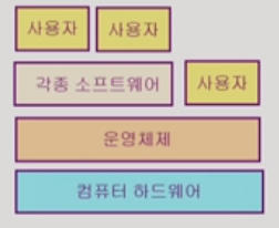 - 컴퓨터 하드웨어 바로 위에 설치되어 사용자 및 다른 모든 소프트웨와와 하드웨어를 연결하는 소프트웨어 계층
