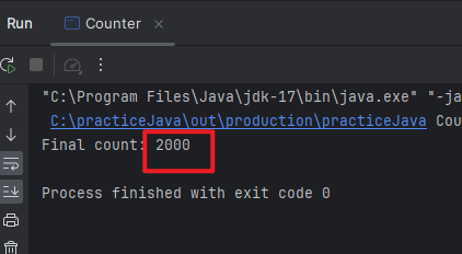 System.out.println("Final count: " + counter.getCount()); // ์์ ๊ฒฐ๊ณผ๋ 2000์ด์ง๋ง, ๊ฒฝ์ ์กฐ๊ฑด์ผ๋ก ์ธํด ๋ค๋ฅธ ๊ฐ์ด ์ถ๋ ฅ๋ ์ ์์
