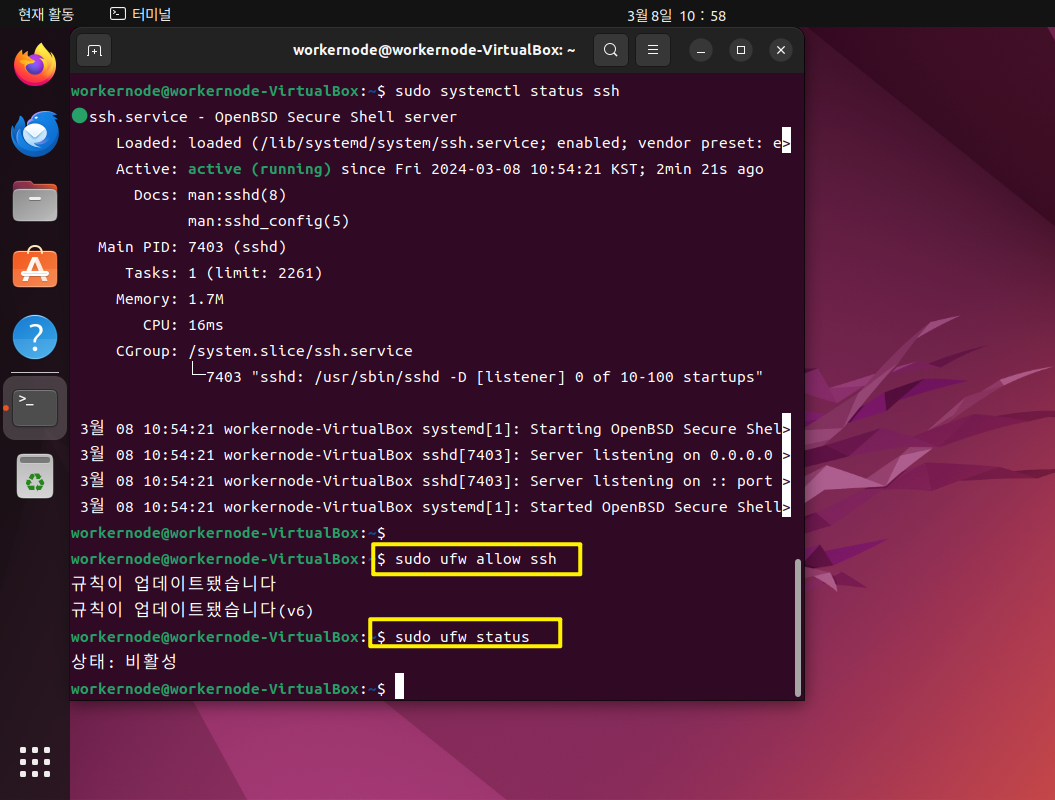 ๋ฐฉํ๋ฒฝ์ ์ฌ์ฉํ๊ณ ์๋ค๋ฉด, ssh๋ฅผ ํ์ฉํ๋๋ก ํ๋ค. ๋ฐฉํ๋ฒฝ์ด ๋นํ์ฑํ๋์ด์๋ค๋ฉด ๊ฑด๋๋ฐ์ด๋ ๋๋ค.