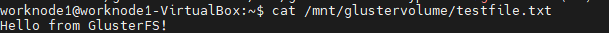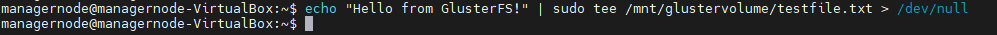 echo "Hello from GlusterFS!" | sudo tee /mnt/glustervolume/testfile.txt > /dev/null