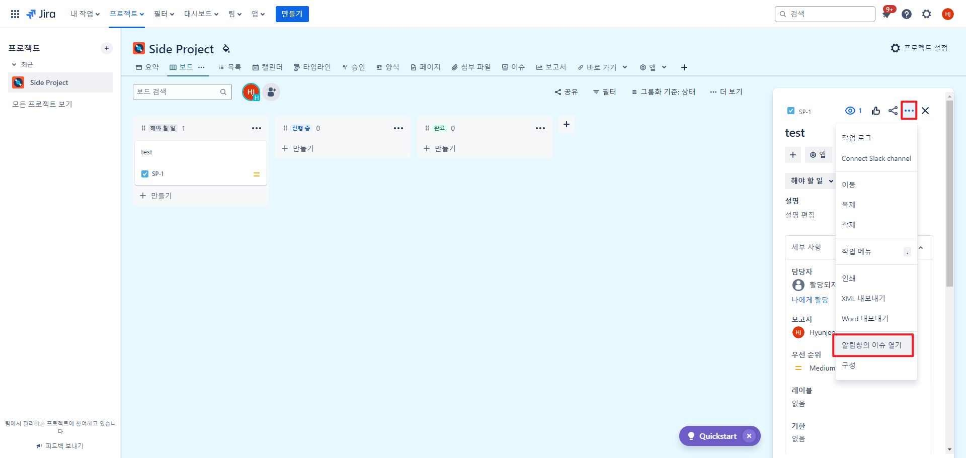 테스크 디테일에 들어가서 설정( · · · ) 선택 후 알림창의 이슈열기 선택