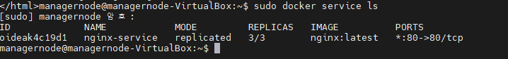 - Nginx 서비스가 Docker Swarm 클러스터에서 실행 중이며, 모든 레플리카가 정상적으로 작동하고 있는지 확인한다. sudo docker service ls 명령어로 서비스 상태를 확인할 수 있다.